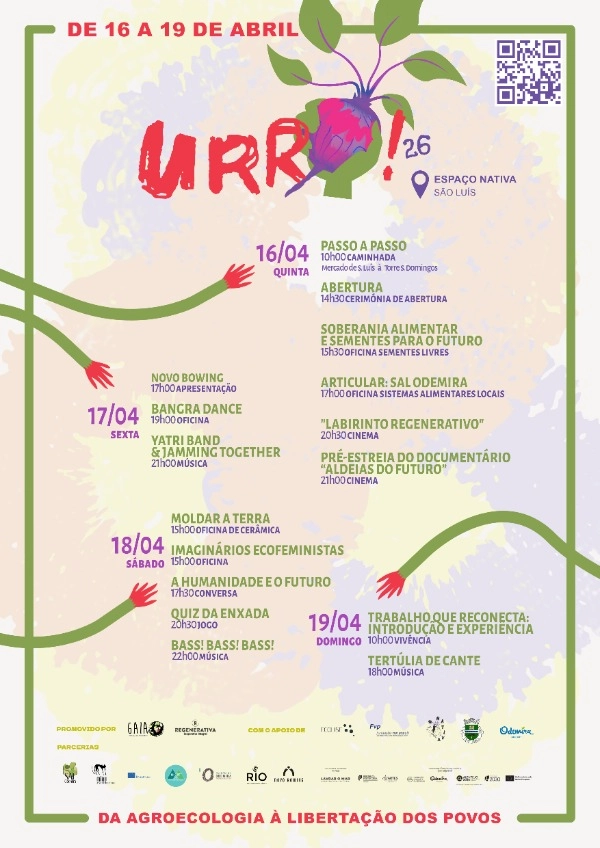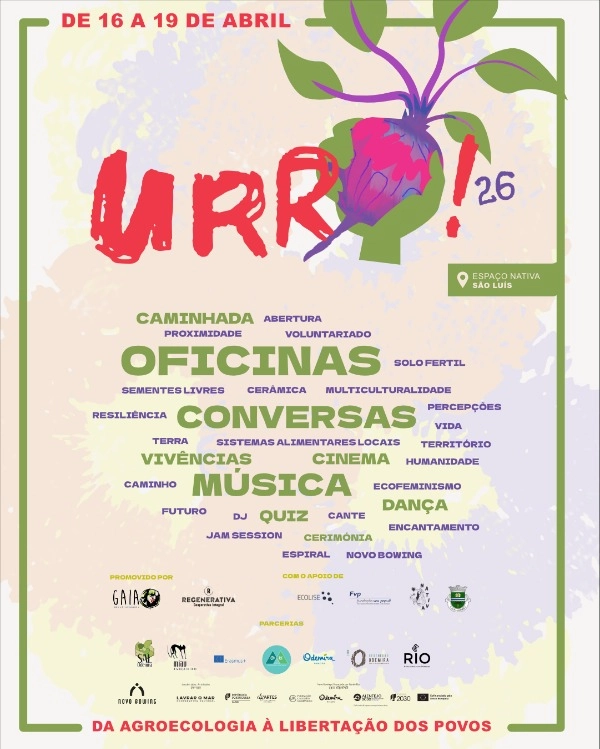 Na sua terceira edição, URRA 2026 acontece entre os dias 16 e 19 de Abril, em S. Luis, é um evento promovido pelo GAIA e Regenerativa Coop, com uma grande lista de apoios e parcerias!